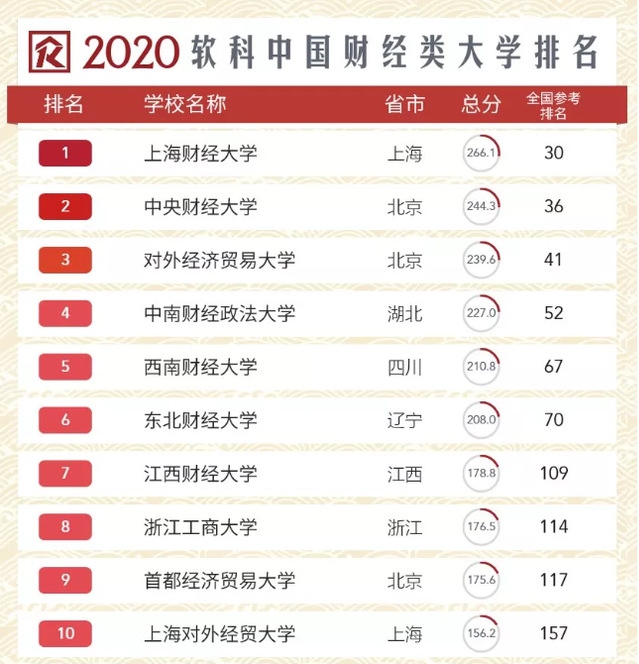 2020软科中国财经类大学排名的上榜高校有51所,我校位居第1。此外,在总榜排名中,我校位居全国第30(参考排名)。