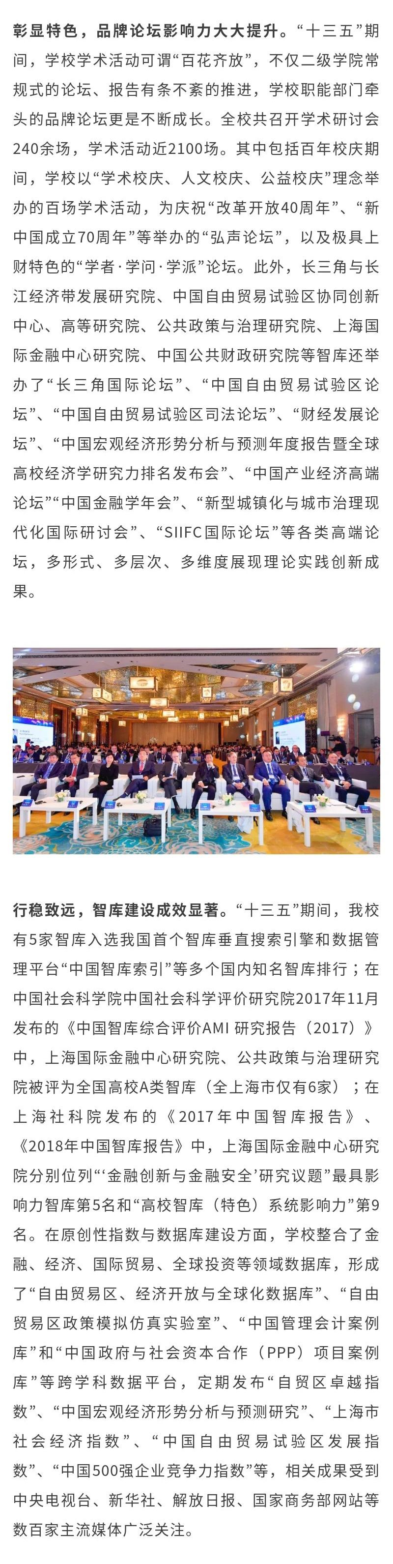 在学校发展史上,“十三五”时期是一个具有里程碑意义的重要阶段:学校迎来新百年,顺利进入国家“双一流”建设高校行列,一流学科建设取得突破性进展,初步建成国际知名具有鲜明财经特色的高水平研究型大学;胜利召开第八次党代会,提出新时代建设鲜明财经特色世界一流大学的宏伟愿景和“三步走”的战略部署。通过“十三五”时期建设,学校发展跃上新台阶,驶向高质量发展新航程。我们正站在新的历史起点上谋划学校“十四五”发展。