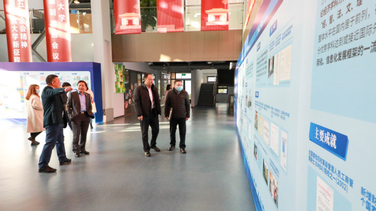 会前,校领导陪同彭斌柏参观《乘风破浪铸辉煌 勇立潮头再出发——上财改革开放以来历次规划回顾展》。